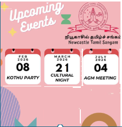RECENT EVENT –நியூகாசில் தமிழ் பாடசலையின் பொங்கல் தின விழா சிறப்பாக 01/02/2026 அன்று Garden Suburb Public School லில் நடைபெற்றது. இந்நிகழ்வில் அனைவரும் ஆவலுடன் கலந்து சிறப்பித்தனர்.